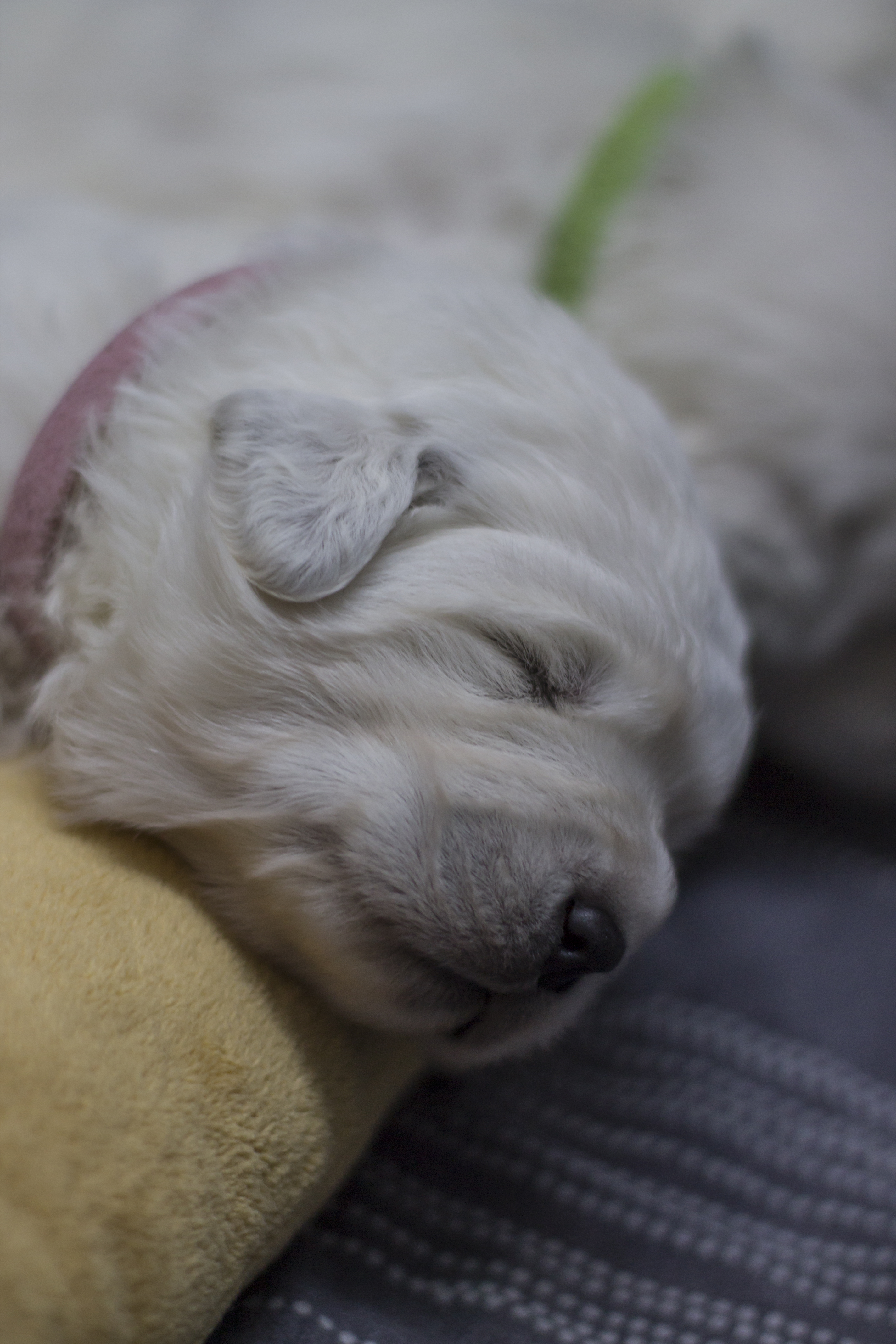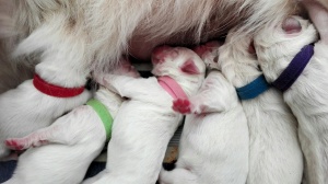 Drie dagen oud zijn de ukkies vandaag en het gaat goed met ze en Duma is een super moeder. Ze gaat niet vrijwillig de werpkist uit, ze wil haar kroos niet alleen laten. De pigmentjes beginnen nu zo langzaam door te komen. Ze laten goed van zich horen als ze honger hebben. De teefjes gaan Ozanna, Ofelia en Okaryna heten. De reutjes, Olek, Orso, Oskar en Onyks.