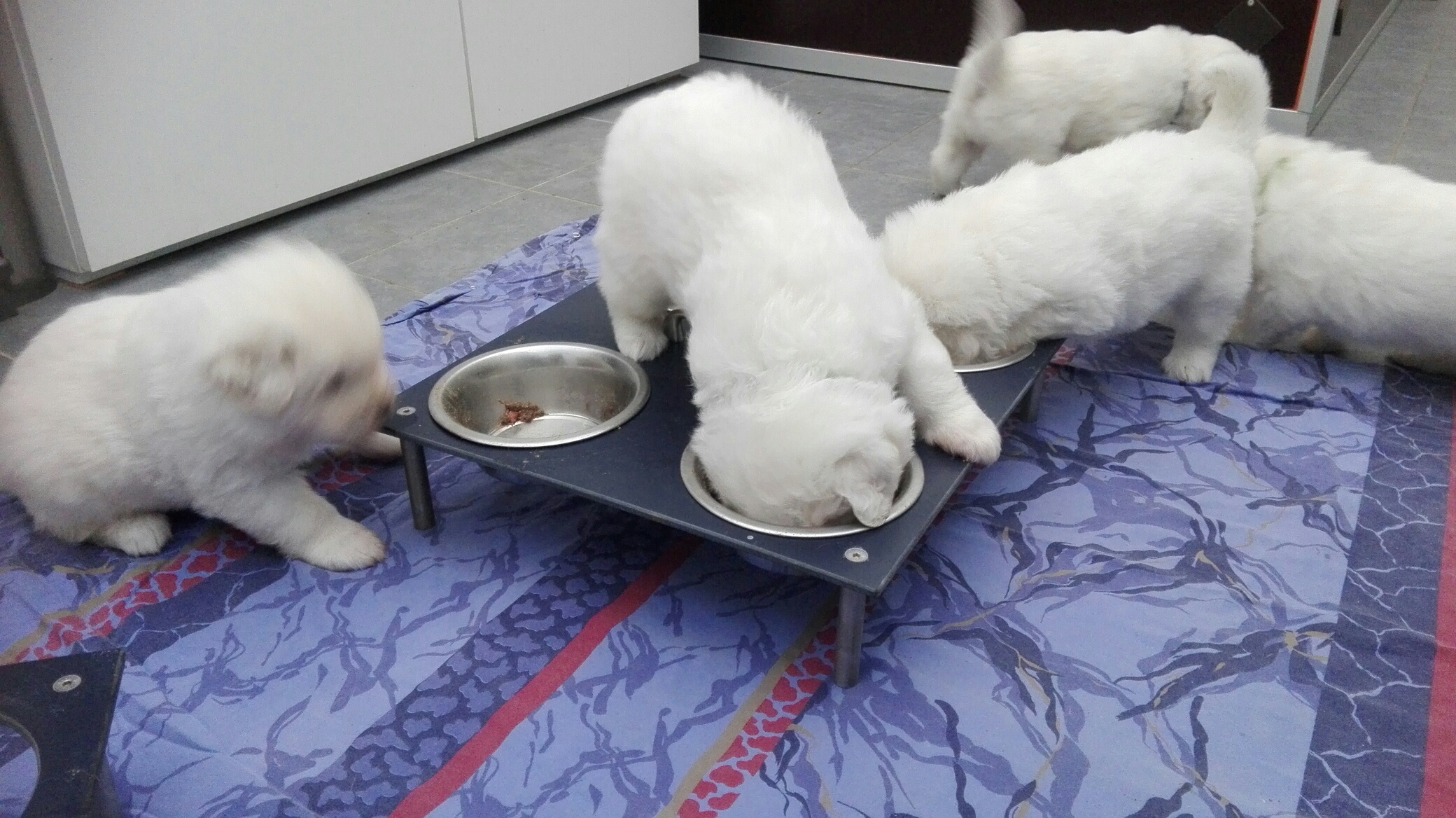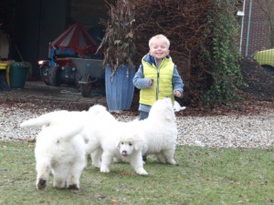 Vandaag drie weekjes oud……….De kraamvisites zijn al in volle gang. De witte bollen spelen nu steeds meer met elkaar en maken van allerlei geluidjes.
