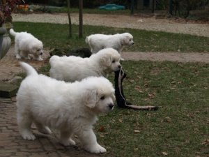 Alle zes witte bolletjes zijn inmiddels al uitgevlogen. We hebben goede berichtjes ontvangen, dat ze de nacht rustig zijn doorgekomen. Ze hebben hier de afgelopen week heerlijk buiten gespeeld samen met de rest van het roedel, ook de kerstboom is tot in de puntjes gesnoeid en het tapijt wat korter geworden. Kortom ze vervelen zich geen moment. Lieve puppies we wensen jullie heel veel liefde bij jullie nieuwe baasjes toe!